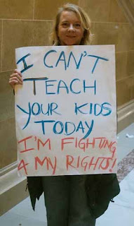 Several years ago my Aunt was at an assisted living home. One of the attendents was a pleasant young woman going to scool to be a teacher. I told her that in spite of the importance of lessons such as: How to put a raincoat on a bannana, the value of diversity, and the impotance of global wrming, she had a more important task. I advised her that if she could teach her pupils the importance of self reliance she would have taught them a skill that would last a lifetime. Needless to say she looked at me like I was orange (no charlie crist jokes please) and had just steped off a spaceship. The teacher in the picture can’t teach because they taught her the wrong lessons in teacher college. Her rights stop when she accepts pay for protesting rather than teaching.
