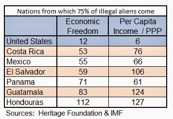 Over the last 15 years 60% of the legal immigration into the United States has come from six countries: Mexico, El Salvador, Guatemala, Honduras, Panama, and Costa Rica. Fully 45% came from Mexico alone. At the same time 75% of illegal immigrants are from those same countries. To see what numbers are really important, take a look at where those countries rank on the Heritage Foundation’s Economic Freedom Index – which includes economic freedom and government regulation and taxation. Whereas the United States is today at a discouragingly low 12 and moving down (1 is the best – Hong Kong & 178 is the worst – North Korea), we are still far above those six countries: Mexico -55, El Salvador -59, Guatemala -83, Honduras -112, Panama -71, and Costa Rica -53. Those immigrants are coming from countries where big government reigns supreme and it shows in their economic standing in the world. Per Capita Income on a purchasing power parity basis – which takes into account the differences in costs in different countries – is perhaps the best way to measure their economic standing. According to the IMF, while Per Capita Income in the US ranks 6th in the world, of these six countries Panama is the highest at 61st and Honduras is the worst at 127th.