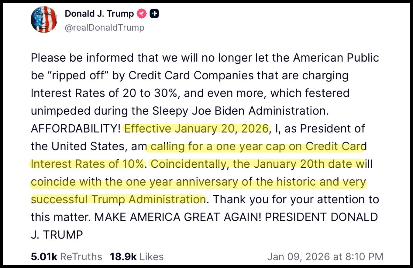 Yesterday, the President of the United States savaged credit card companies and called for what appears to be a voluntary ten percent (10%) cap on credit card rates starting January 20th— the one-year anniversary of Trump’s second Inauguration. My spider senses are tingling that we should expect some pretty ripe progress leading up to that memorable date. But I digress. Here’s what President Trump actually said. Note the word affordability in all-caps: