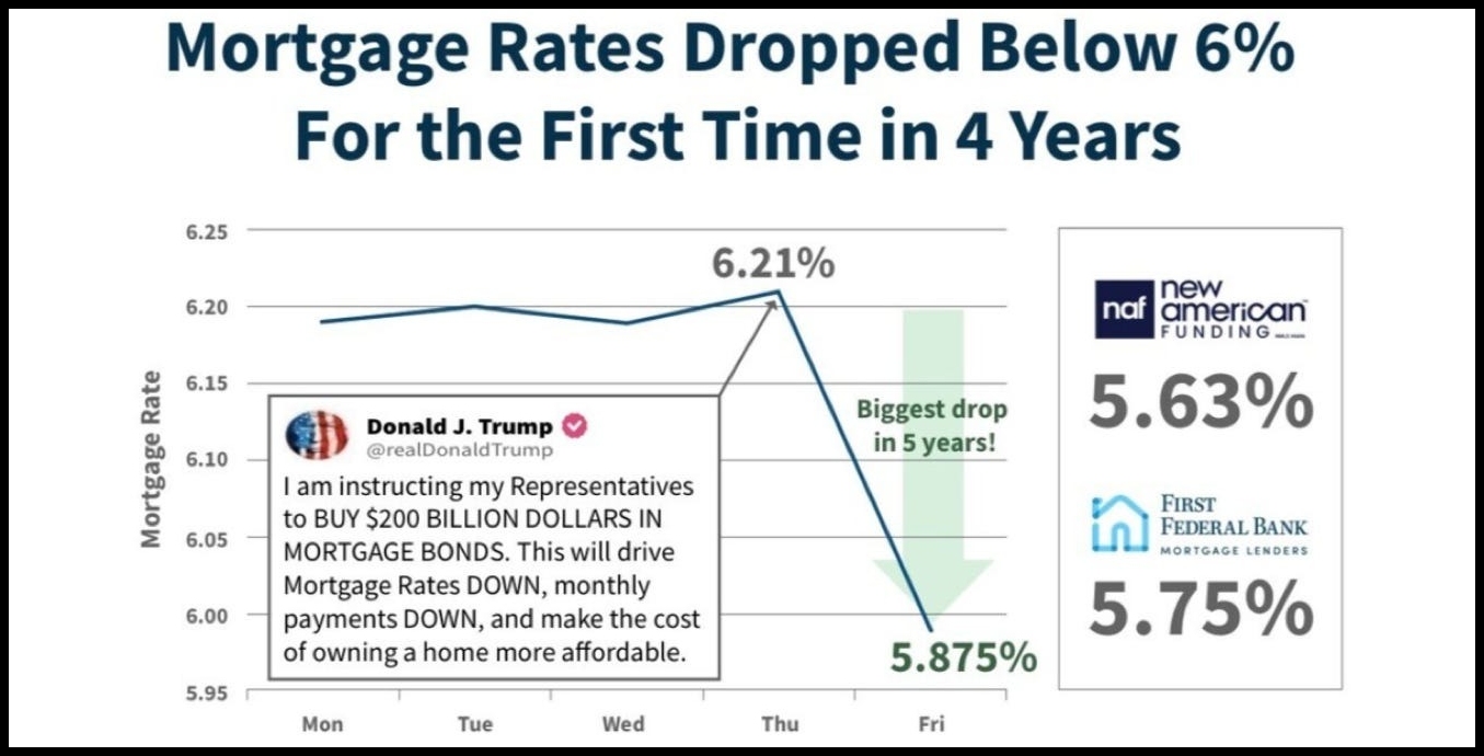 Mortgage rates just slipped under 6% for the first time in four years. Without any help from the Fed. With no bonds purchased yet. With no new program rolled out. Just a single Truth Social post from Donald J. Trump— and the market skipped like a new lamb in Springtime.