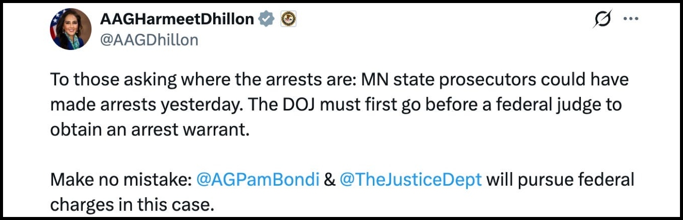 To those asking where the arrests are: MN state prosecutors could have made arrests yesterday. The DOJ must first go before a federal judge to obtain an arrest warrant.