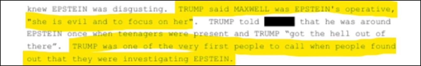 Trump offered cops additional details. He pointed Chief Reiter toward New York, and toward Ghislaine Maxwell, telling the Chief she was Epstein’s “operative,” and that “she is evil and to focus on her.” The transcript added that Trump told Reiter, “he was around Epstein once when teenagers were present and Trump ‘got the hell out of there.’”