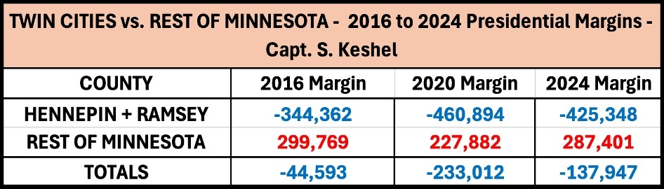 Wisconsin always votes to the right of Minnesota. Every analyst with a brain knew that if Trump carried Wisconsin, he would have already carried the requisite majority of electoral votes to become president again; therefore, with no scenario plausible in which Minnesota would be the tipping point state, there was no purpose in campaigning for it in 2024. Yes, there were a few events, but it became clear by late summer Hennepin and Ramsey Counties, which are choked out with Somali fraud, would provide enough margin to make it 13 straight presidential elections won there by the Democrat nominee (the longest such streak in the nation).