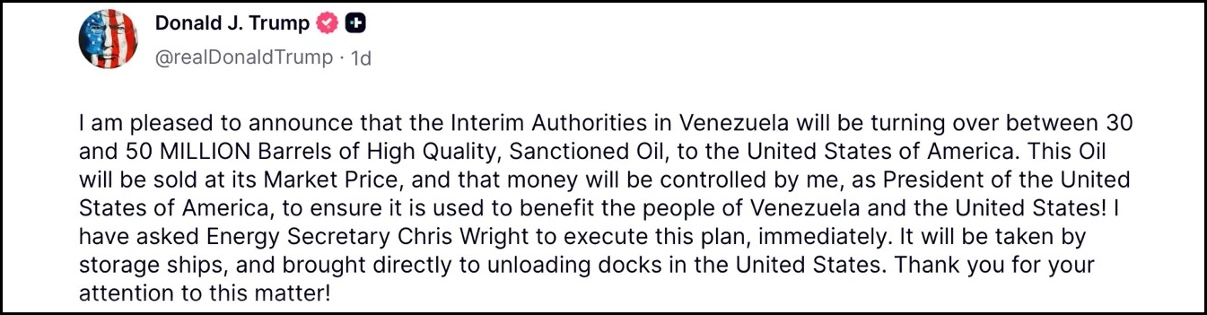 Not just that. Also yesterday, President Trump dramatically announced that Venezuela would be “donating” to the U.S. millions of barrels of high-quality crude oil (worth billions), immediately. Thank you for your attention to this matter.