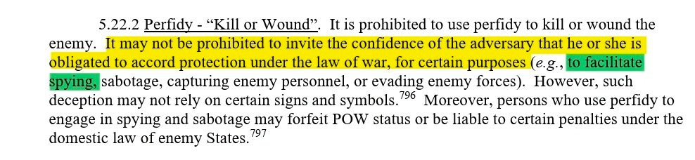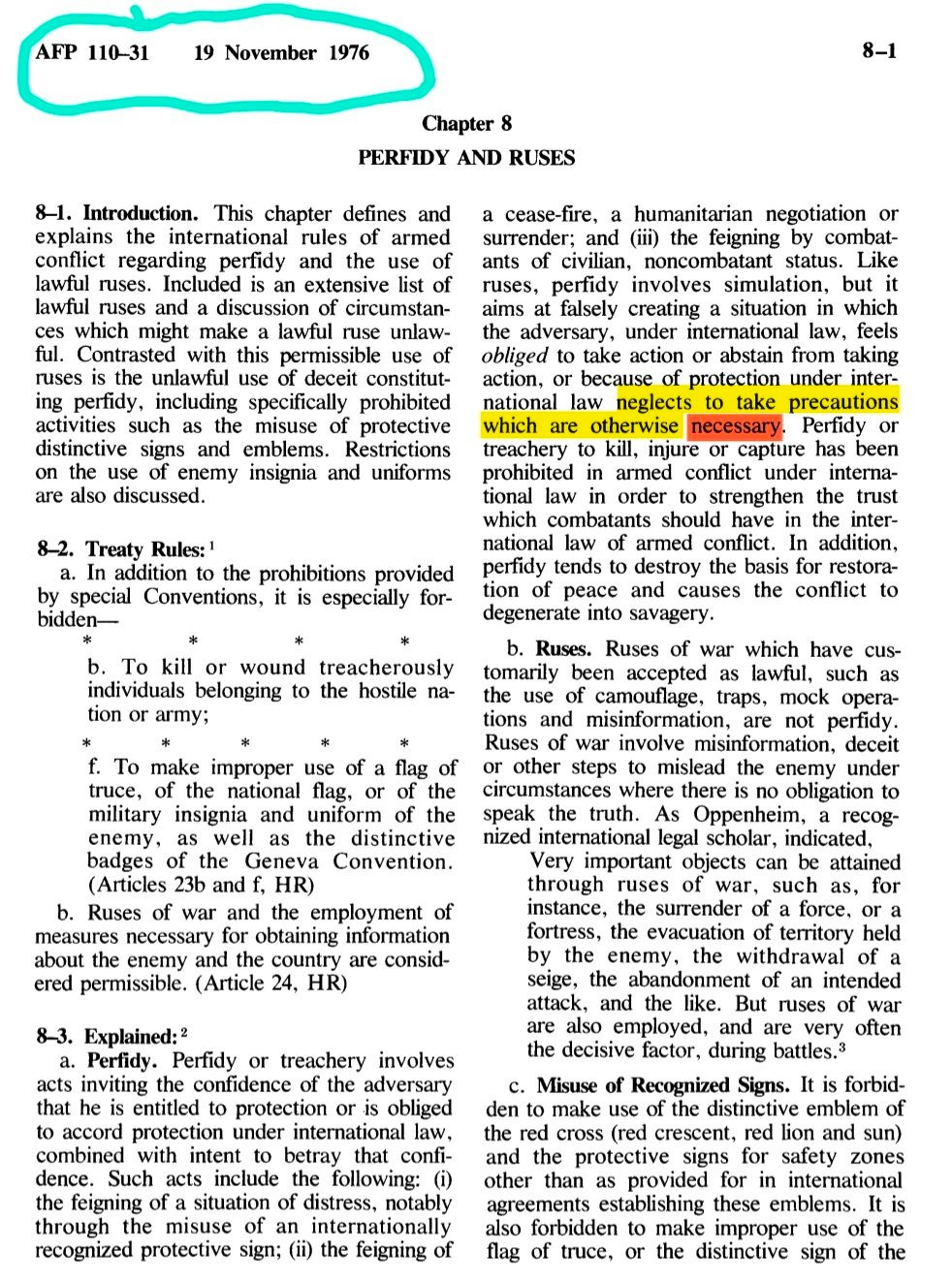 Not “perfidy” & not a war crime. Even if everything reported in this @nytimes story by @charlie_savage et al were regarded as true, this STILL would not qualify as perfidy. Here’s why.
