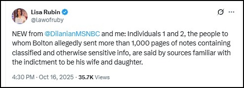 Those individuals are identified as “Individual 1” and “Individual 2” in the indictment. In one message, Bolton referred to them as his “editors.” MSNBC, which would most certainly have the ability to contact Bolton directly, is reporting that they are his wife and daughter.