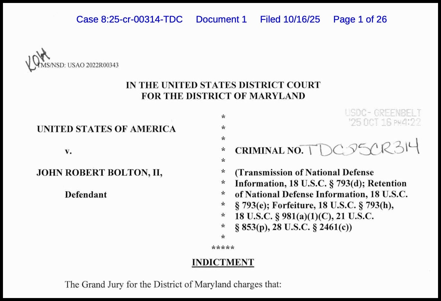 John Bolton, President Trump’s former National Security Advisor (NSA), has been indicted by a grand jury for the District of Maryland. Here is the indictment.