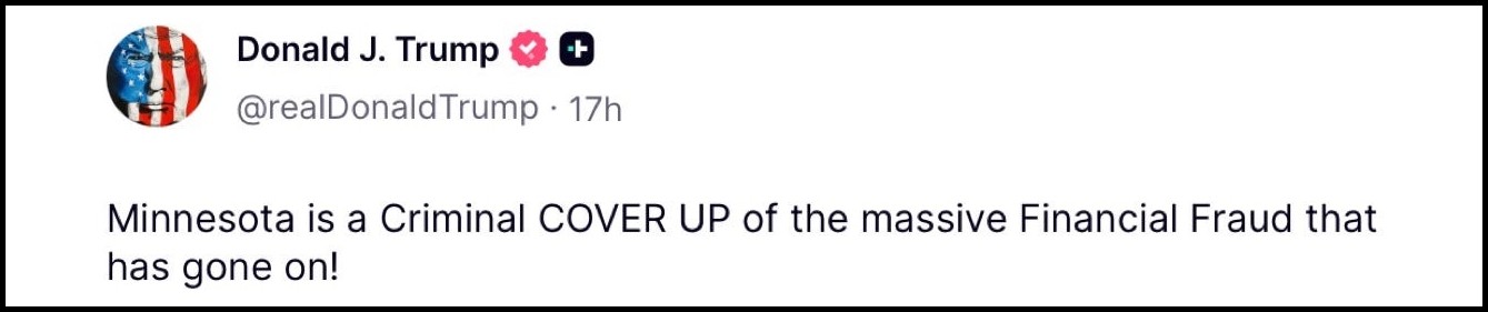 🔥 It’s also worth noting that the streets of Minneapolis (-17 degrees) were calm until just after Operation Metro Surge began in response to the Quality Learing fraud. Are the protests a cover up? Yesterday, President Trump posted this: