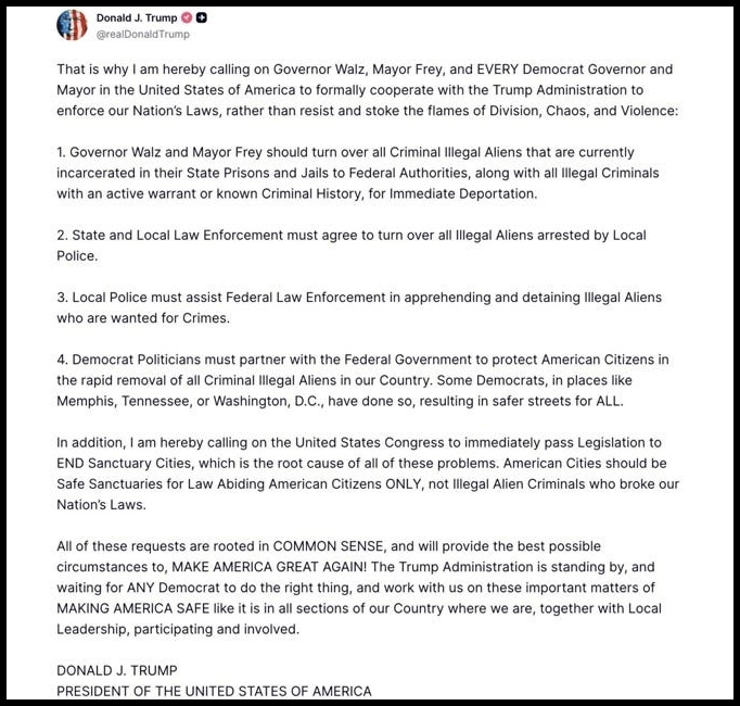 He immediately followed that post with an even longer one, “formally” demanding that blue states begin cooperating with immigration enforcement: